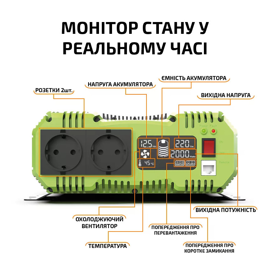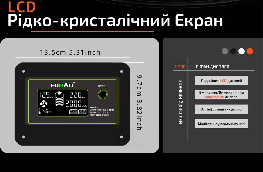 | Информация на дисплее | Заряд аккумулятора %, Напряжение аккумулятора, AC напряжение, AC мощность, температура | |