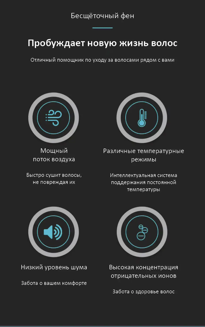 4 режима температуры — для разных типов волос и задач: от бережной сушки до быстрой укладки.