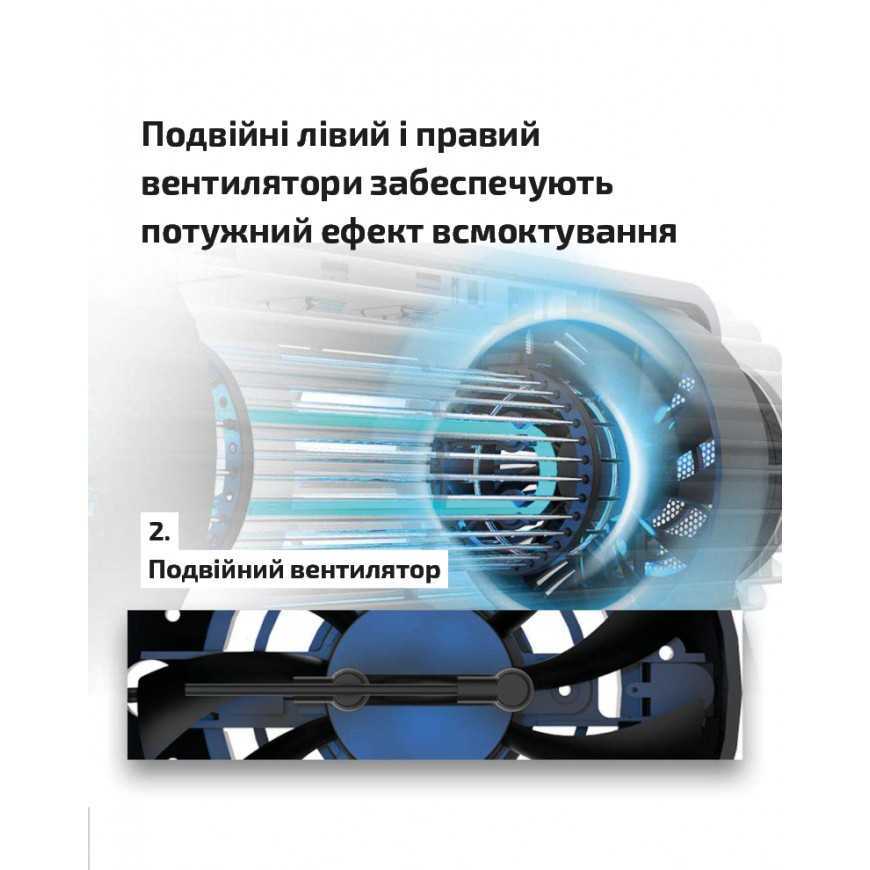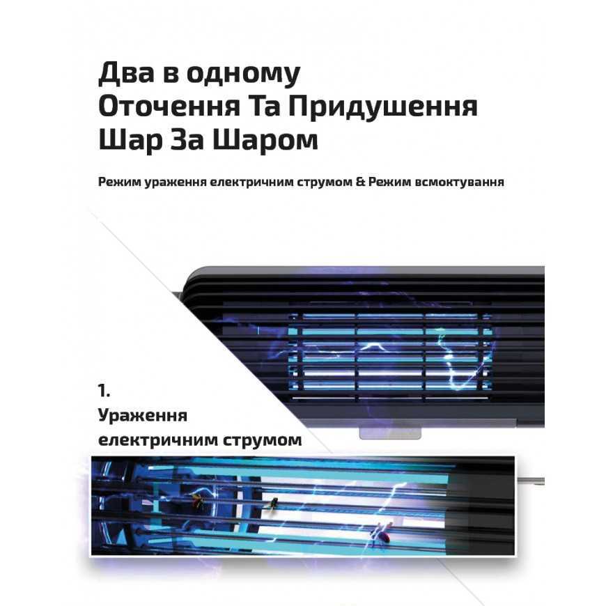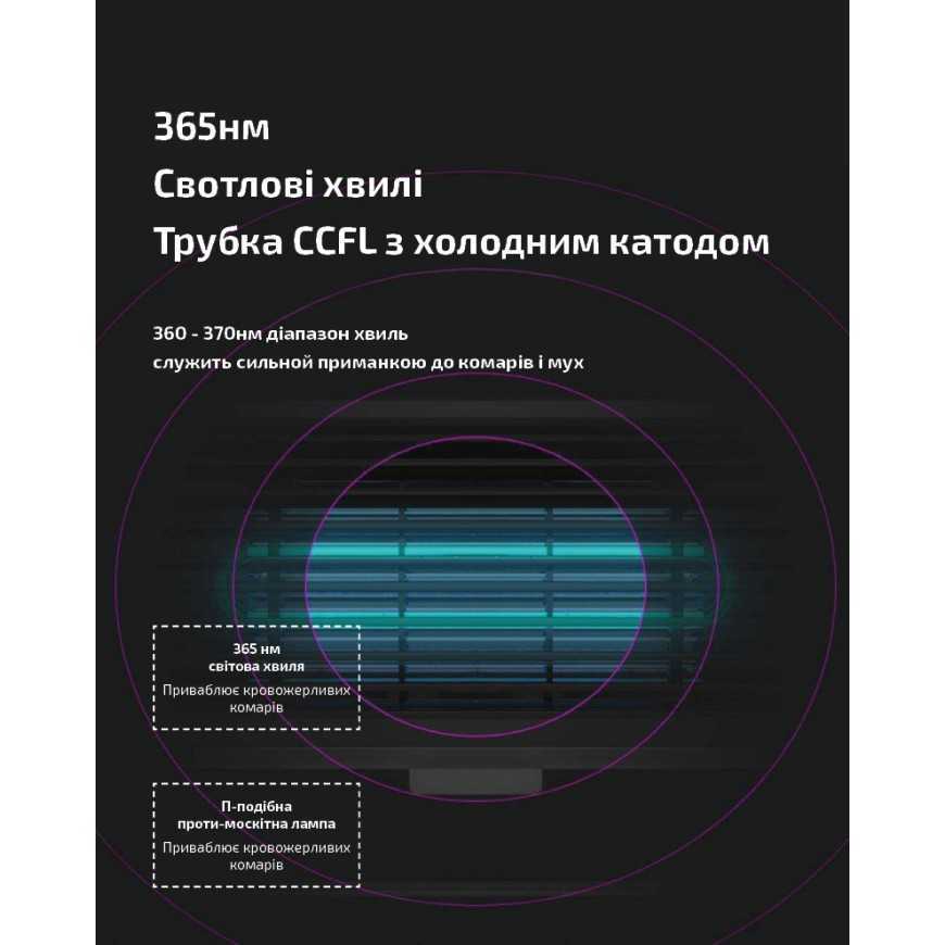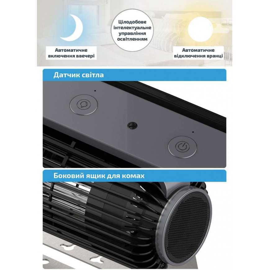 Уничтожитель оснащен датчиком света (сам включается ночью, выключается утром) и двумя режимами работы (только лампа / лампа + всасывающие вентиляторы)