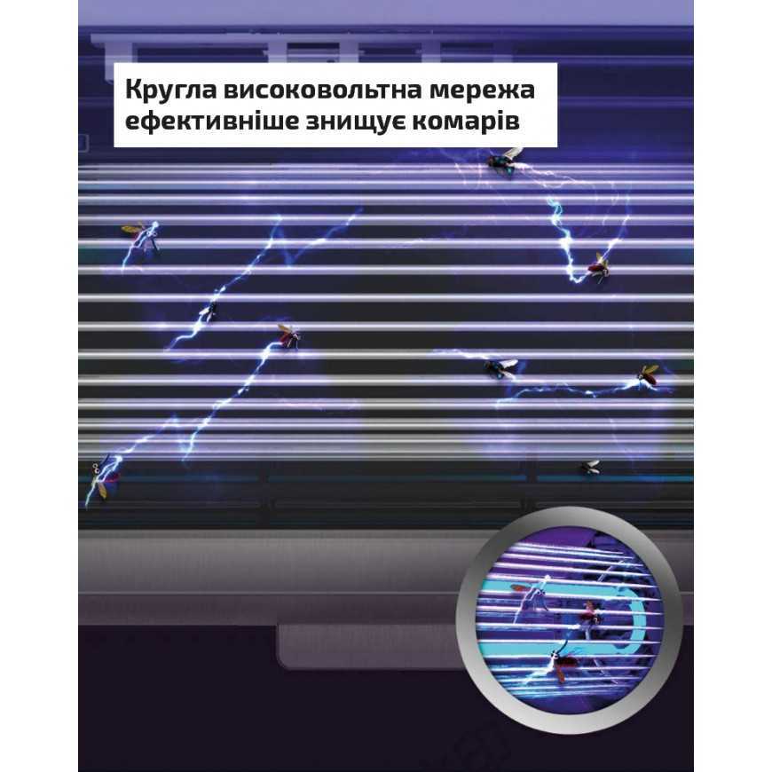 Принцип действия – устройство привлекает насекомых ультрафилетовым светом, который излучает лампа, установленная внутри. Два вентилятора работают на всасывание и затягивают насекомых, когда те подлетают к устройству. После этого, насекомые уничтожаются электрическим током, который проходит по внутренней металлической решетке.
