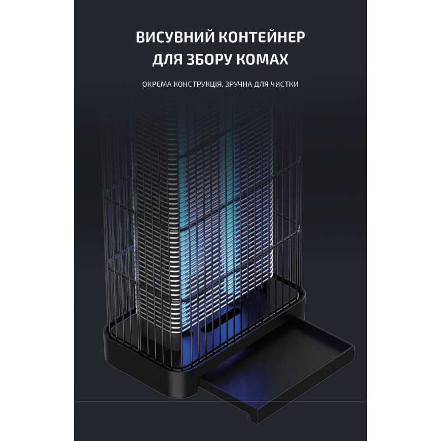 Принцип действия – лампа уничтожает насекомых с помощью внутренней решетки, по которой проходит напряжение 600В. Комары, мухи и прочие насекомые привлекаются светом двух ультрафиолетовых ламп. Ультрафиолетовый свет чрезвычайно эффективен в привлечении насекомых т.к. повторяет естественный солнечный свет. Конструкция внешней решетки позволяет уничтожать даже больших мух.