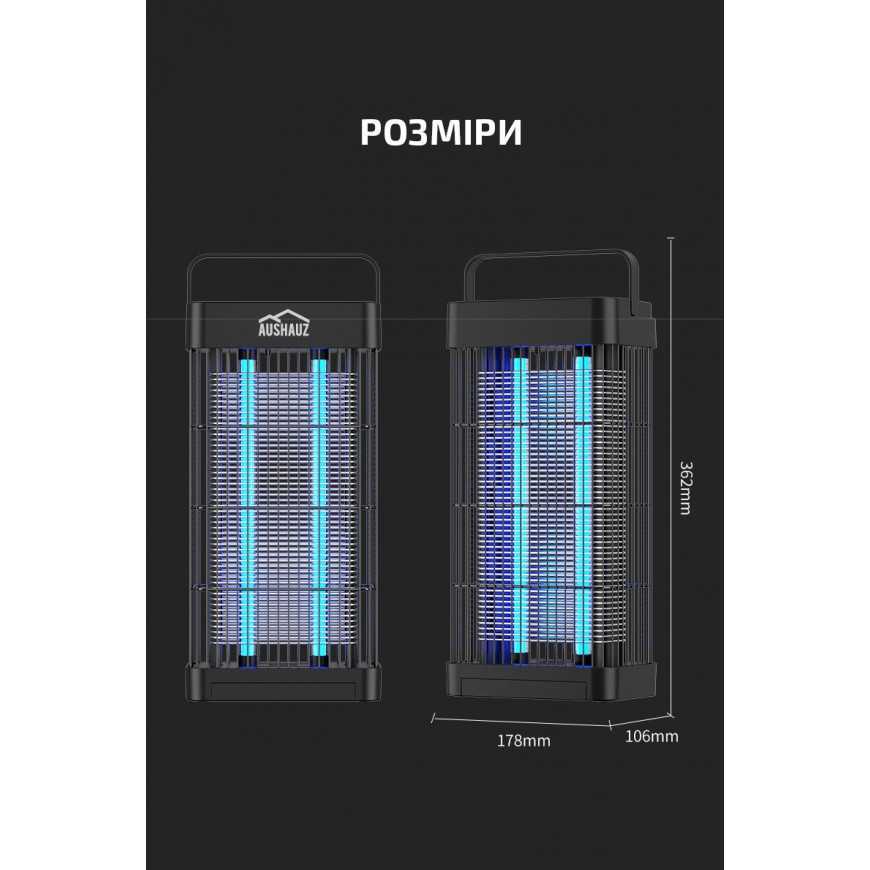 Размеры – 36,2см Х 10,6см Х 17,8см лампа уничтожитель насекомых может быть компактно размещена на столе или подоконнике. Так же ее можно подвешивать за ручку.