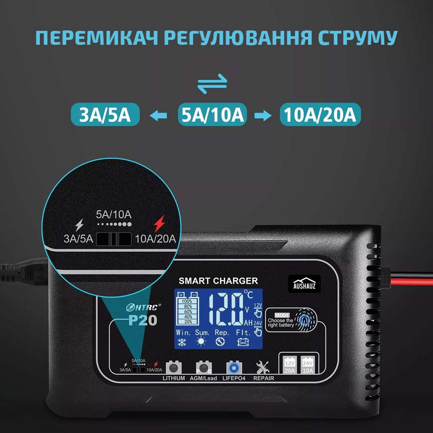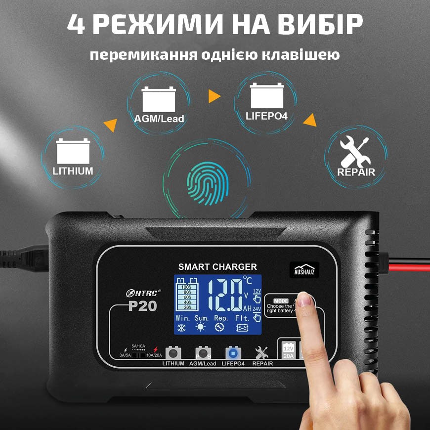Розумний зарядний пристрій 20 Ампер для AGM, LiFePO4, Гелевих, Л