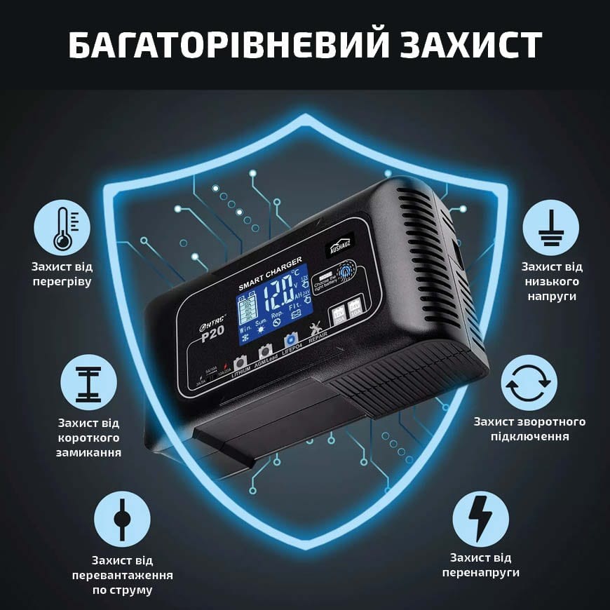 Множинний захист - захист від перезаряду, захист від зворотної полярності, захист від перевантаження по струму, захист від короткого замикання, захист від перегріву.