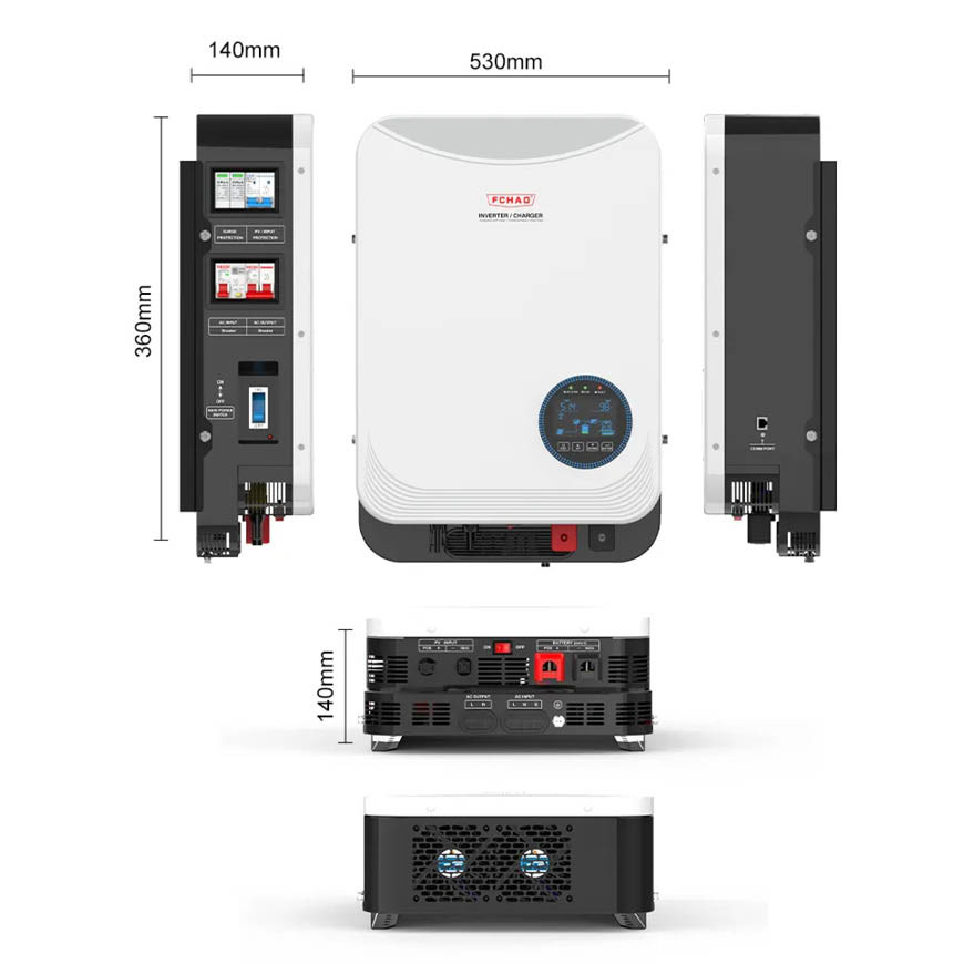 Гібридний інвертор FCHAO 6.2 кВт з вбудованим щитком і Wi-Fi модулем. Інвертор оснащений усіма необхідними автоматами захисту, а Wi-Fi модуль дозволяє зручно налаштовувати інвертор та моніторити поточний виробіток сонячних панелей та споживання через додаток у смартфоні на відстані.