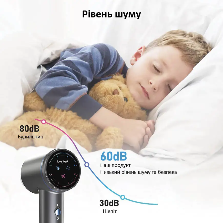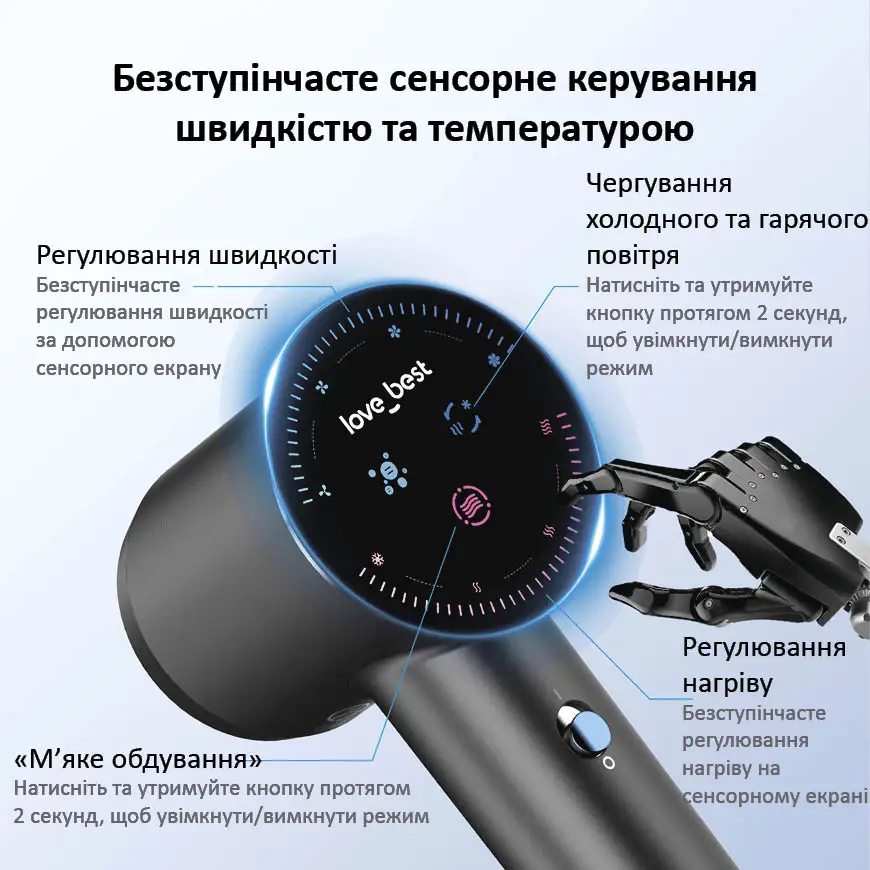 Сенсорний дисплей дозволяє точно натраювати температуру і швидкість потоку повітря, а також активувати додаткові режими - Чергування холодного та гарячого повітря та М'яке обдування.