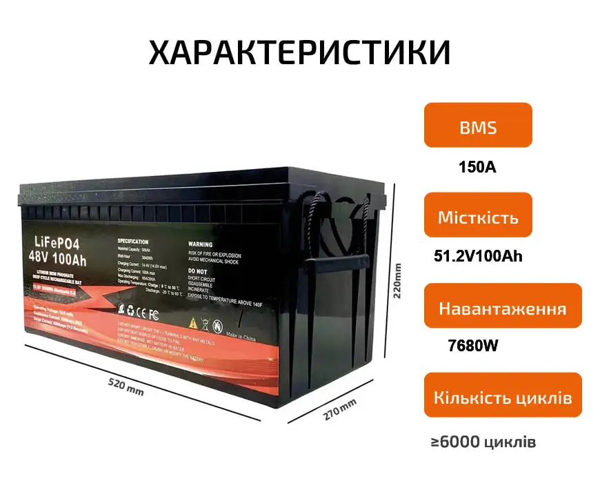 | Ємність | 100 Аг (5120 Ватт/год.) | |